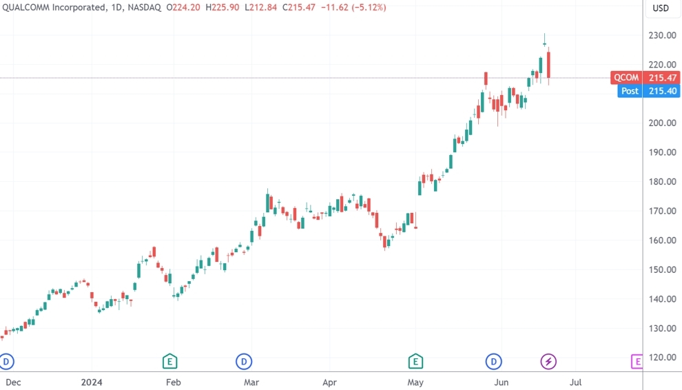 截至美股周四收盘,在自身利空和芯片板块整体表现不佳的联动下,高通单日大跌超5%,接近回吐本周所有涨幅。作为“AI PC”概念的当红炸子鸡,高通在过去一年里实现股价翻倍。