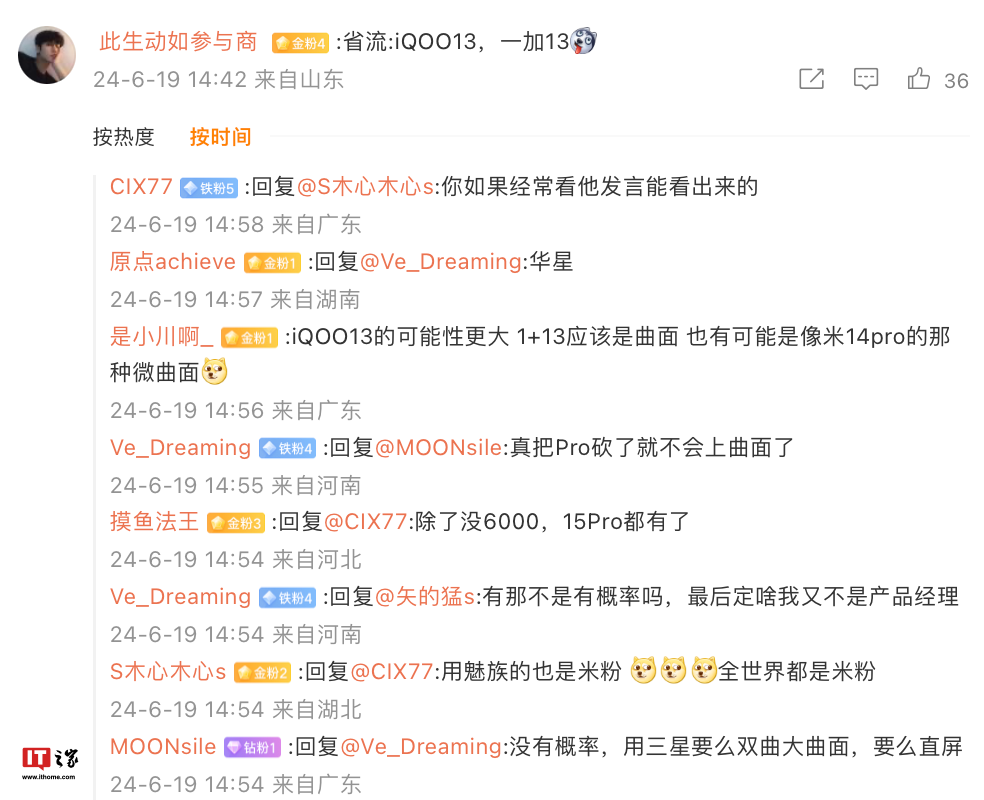 评论区多名用户认为这款新机是 iQOO 13 或一加 13,不过IT之家综合比对此前报道,该机为 iQOO 13 的可能性更大(一加 13 据称为曲屏),参考目前已知信息,iQOO 13“中杯工程机”屏幕分辨率为 2800×1260 ,采用 8T LTPO 直屏,搭配 16GB RAM 及 1TB 存储空间。