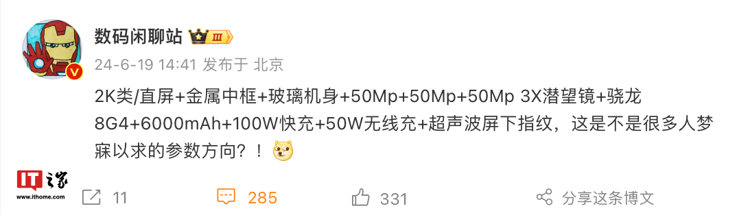 文章来源于互联网:IT之家-iQOO 13 手机规格曝光:骁龙 8G4 + 50MP 主摄 / 超广角 / 潜望长焦 + 6000mAh 电池
