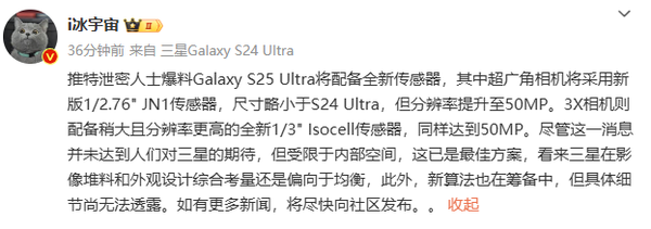文章来源于互联网:凤凰网-曝三星S25 Ultra将配备全新传感器 但尺寸小于前代机型