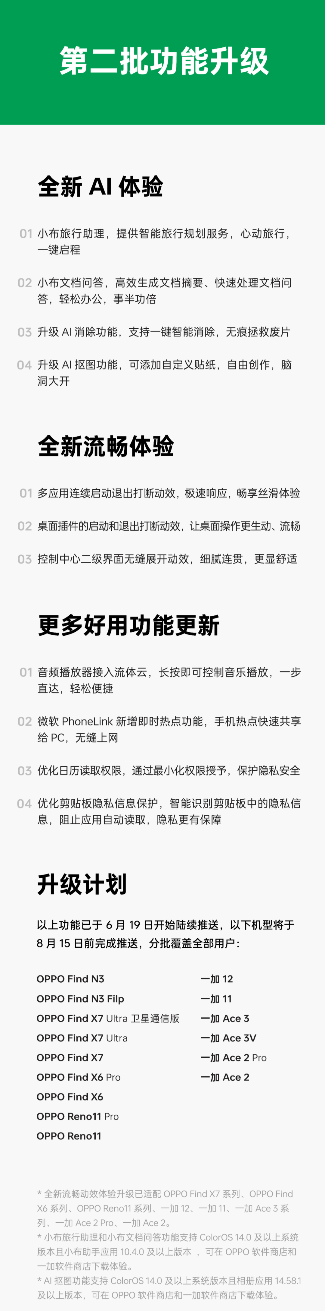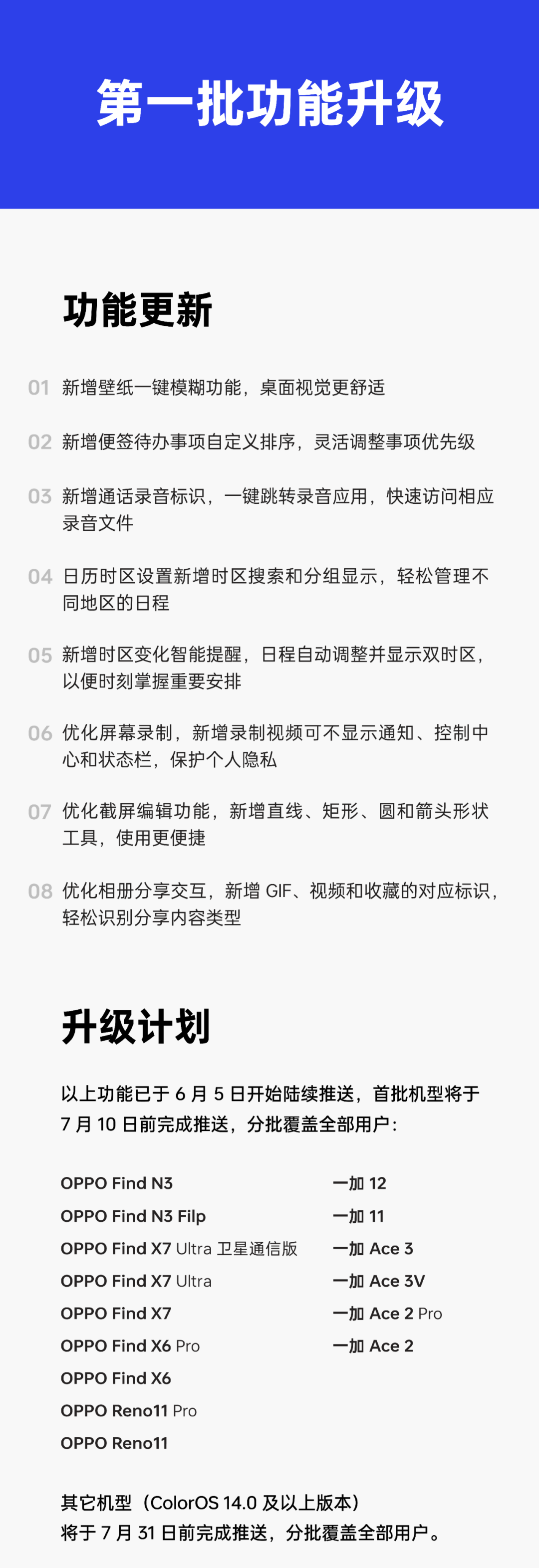其它机型 (ColorOS14.0 及以上版本) 将于 7 月 31 日前完成推送,分批覆盖全部用户。