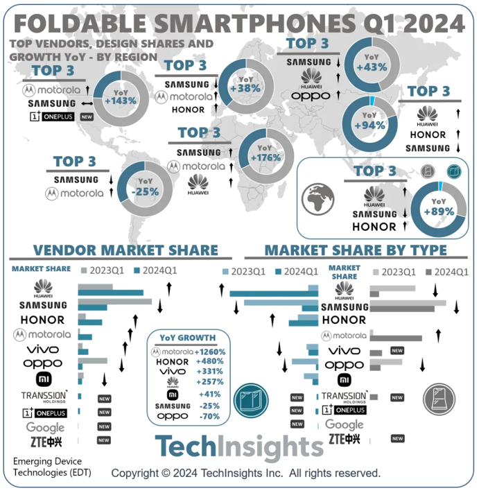 另外根据市场调研机构 TechInsights 最新报告显示,2024 年 Q1,荣耀折叠屏市场份额在全球和西欧排名第三,在中国排名第二;横折折叠屏在全球和西欧、中国排名第二。这些数据表明,荣耀折叠屏家族在此次 618 中的出色表现并非偶然,他们的创正在为整个行业注入源源不断的活力,也正引领行业朝着更加多元化的方向发展,为广大用户带来更多前沿科技的非凡体验。