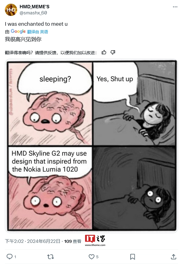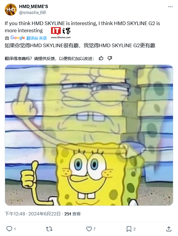 IT之家翻译消息源的推文内容如下:“HMD 的 SKYLINE 已经足够有趣了,而即将到来的 SKYLINE G2 更加有趣”。