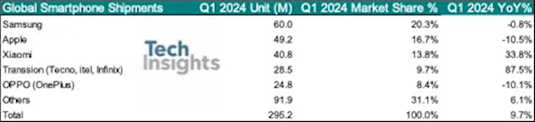 快科技5月7日消息,市场分析机构TechInsights最新发布了2024年Q1全球智能手机市场报告。