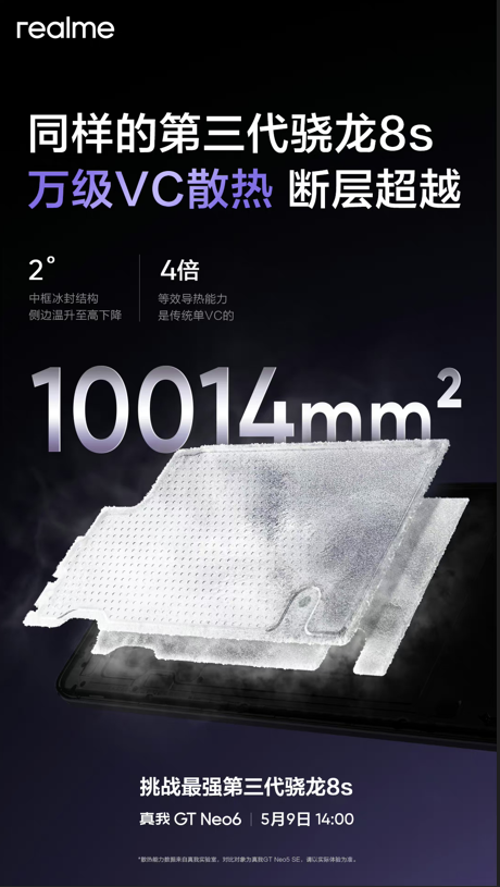据官方介绍,真我GT Neo6将挑战最强第三代骁龙8s,其配备的散热模块规模超过了1万平方毫米,即10014平方毫米,具有传统单VC的等效4倍导热能力,中框采用了冰封结构设计,侧边温升最高可下降2摄氏度。