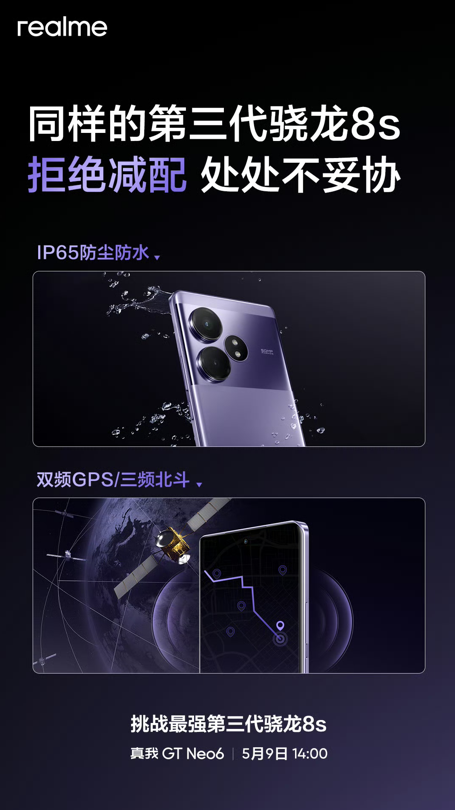文章来源于互联网:快科技-真我GT Neo6产品力拉满:IP65防水、双频GPS、三频北斗定位均在列