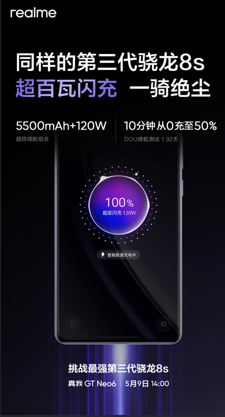 在充电规格方面,真我GT Neo6将配备Neo6 SE同款的5500mAh大电池,快充功率从100W提升到120W,理论上满电速度将更快,据介绍,10分钟即可将电量从0%充至50%。