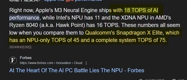 但问题来了,苹果现在最新的 M3 芯片,AI 性能并不算强。。。
