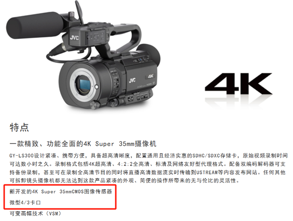 最直接的例子:JVC GY-LS300电影机在M4/3卡口里放了16:9尺寸的Super35画幅传感器。(松下GH1/GH2/GH5S的传感器尺寸也超过了4/3英寸)