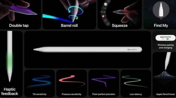 Apple Pencil Pro的新增功能还包括侧边摆放充电、通过“侧旋功能”特性在不触控屏幕的情况下调出各种工具,以及全新的传感器增加触觉反馈等。