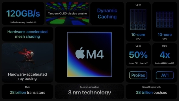 全新M4芯片基于第二代3nm制程工艺,最多拥有10核CPU(4个性能核心和6个能效核心)和10核GPU。