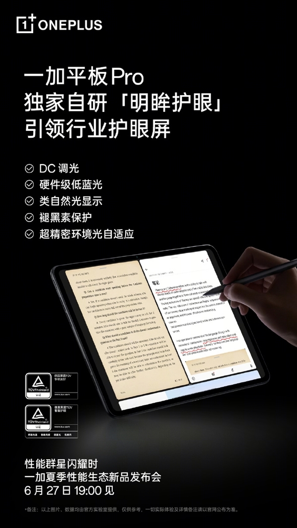 快科技6月25日消息,一加夏季性能生态新品发布会将于6月27日19:00举行,届时,一加首款平板——一加平板 Pro将正式发布。