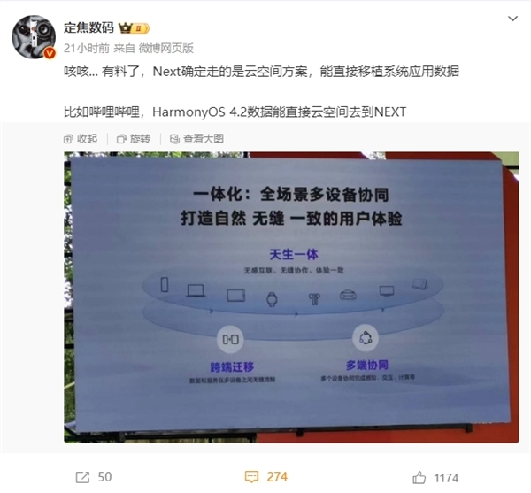 对此,博主@定焦数码 表示:“Next确定走的是云空间方案,能直接移植系统应用数据,比如哔哩哔哩,HarmonyOS 4.2数据能直接云空间去到NEXT 。”