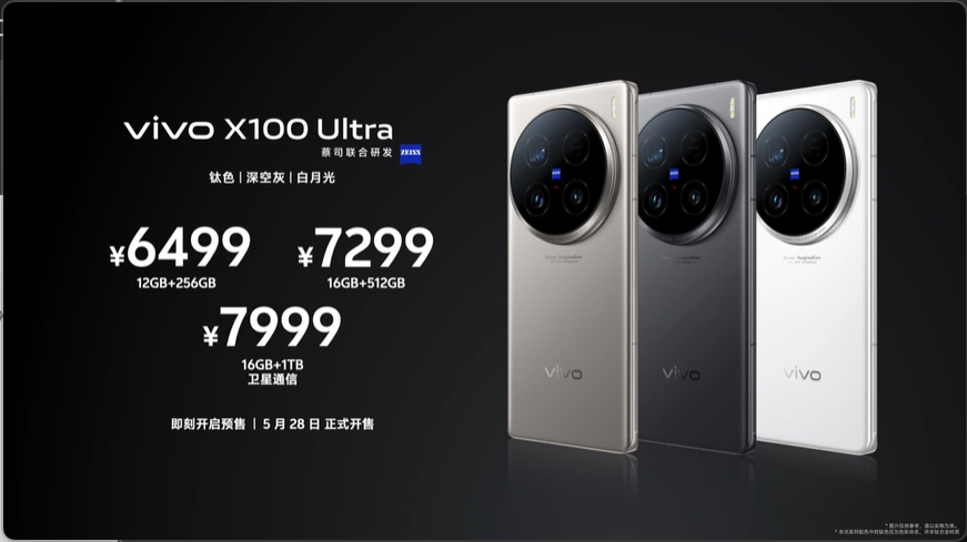 vivo X100 Ultra 售价 6499 元起,5 月 28 日正式开售,即日起至 5 月 30 日购买 X100 Ultra,限量赠送 vivo TWS A1 Pro。IT之家附新机具体售价如下: