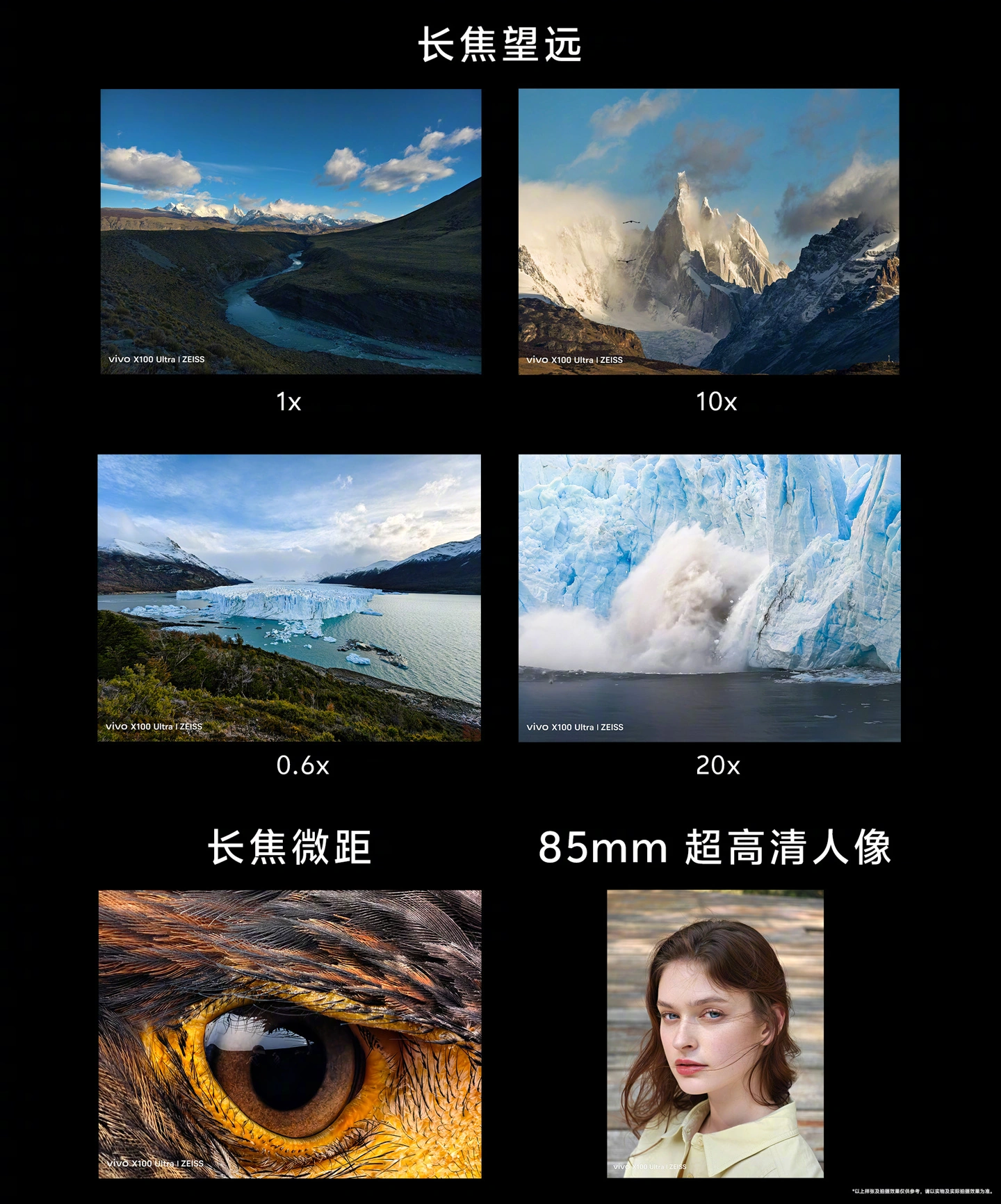 vivo X100 Ultra 搭载蔡司 2 亿 APO 超级长焦,拥有 2 亿像素、1/1.4 长焦大底,采用 FCD100 萤石级玻璃镜片,阿贝数 95;支持 CIPA 4.5 级防抖;还有蔡司 APO 色差控制标准,全新蔡司 T * 镀膜。支持长焦微距,20x 等效 3.4 :1 微距放大倍率;长焦人像,85mm 超高清人像,还有蓝图开发的人眼对焦算法,各种复杂角度都能精准识别对焦眼睛。