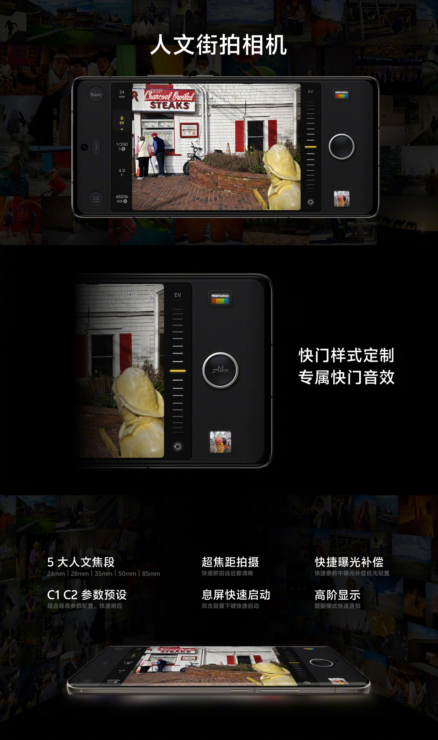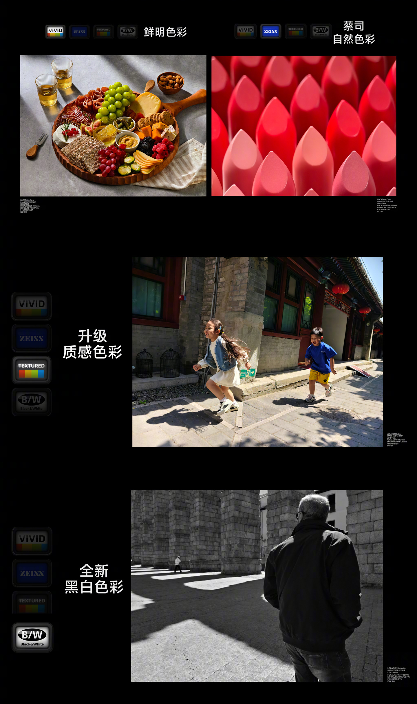 vivo X100 Ultra 新增人文街拍相机模式,重新整合拍摄交互界面,提供更效率、更专业的横屏相机,可调节光圈,零延时抓拍。全新「黑白色彩」,展现出色的阴影细节和高宽容度,在影调上还原和表达我们对世界本质的理解。同时还升级了「质感色彩」,更加个性、浓烈、直观。vivo 还推出了与斯莫格共同研发设计了非常人文复古的 FilMov 影像套装,支持快速抓拍、灵活变焦、便捷调参、自定义等。
