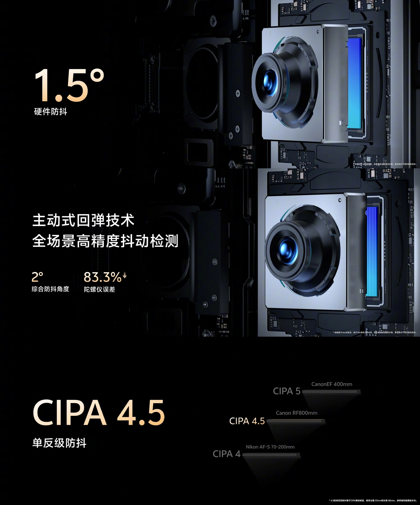影像方面,X100 Ultra 搭载一英寸云台级主摄,采用 vivo 独家精度跃迁技术,实现超高精度控光,综合清晰度提升 20% 以上;蔡司 T * 镀膜行业首发 GLC 纳米涂层技术,同时解决鬼影和发雾问题,可见光平均反射率小于 0.2%;1.5 度硬件防抖,综合防抖角度高达 2 度,达到专业认证标准 CIPA 4.5 级。