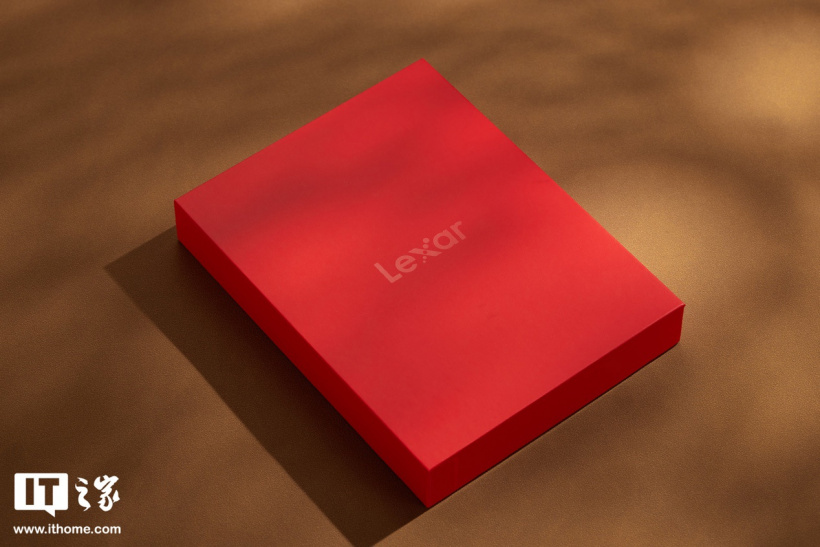 抽开外层封皮,大红色的内包装映入眼帘,居中位置印着 Lexar 的标志,质感非常高级。