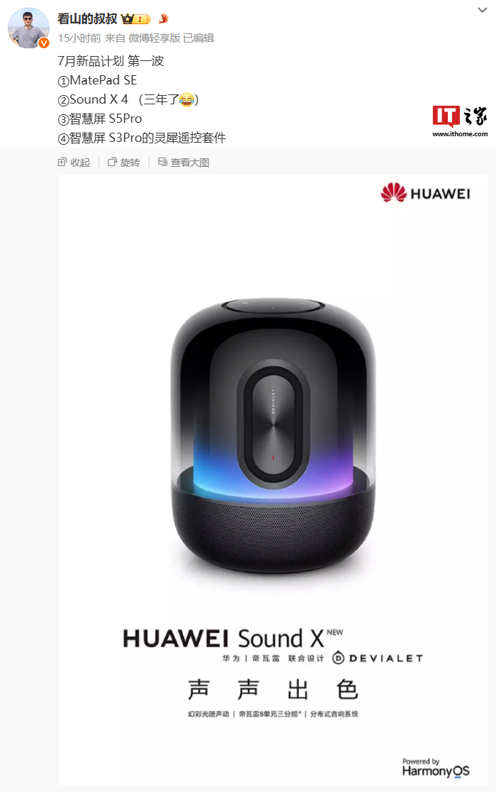 IT之家 6 月 26 日消息,博主 @看山的叔叔 今日发文,爆料了华为 7 月新品发布计划,包含平板、音箱、智慧屏以及灵犀遥控套件。新品详情如下:
