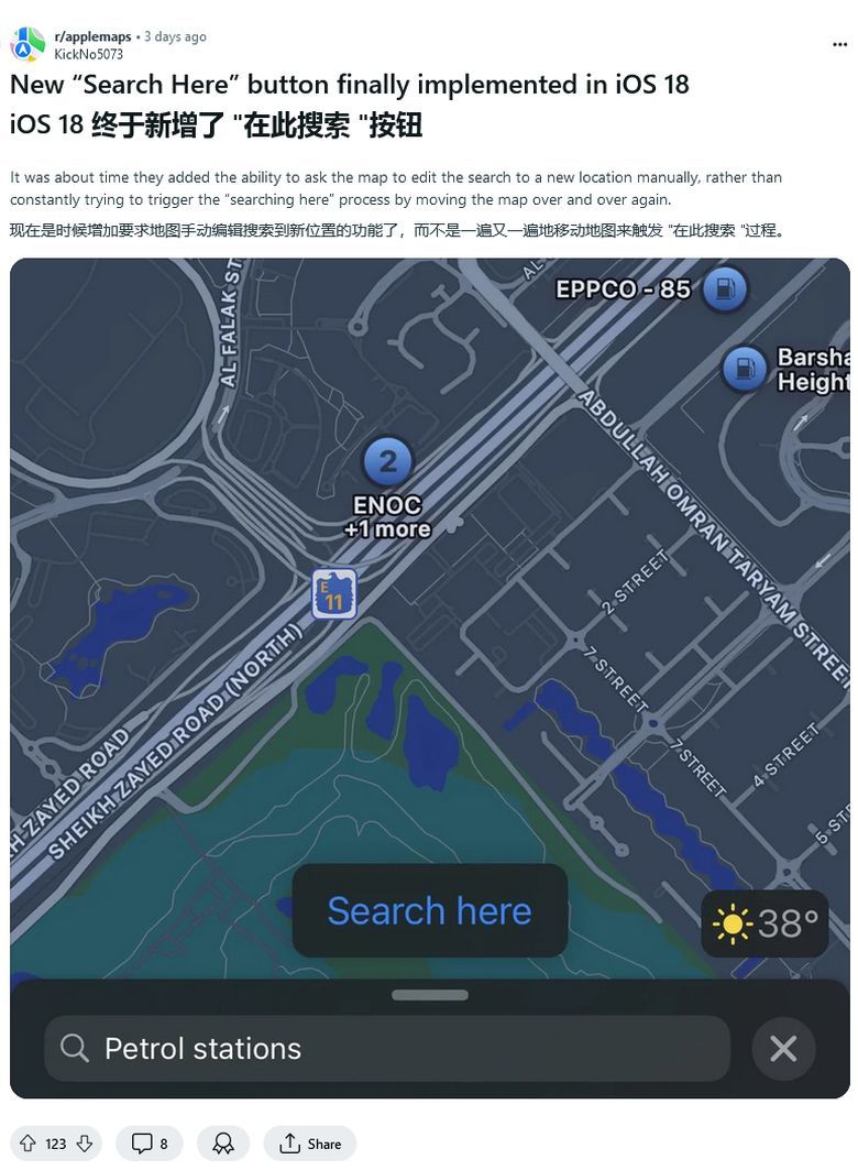 文章来源于互联网:凤凰网-苹果iOS 18地图应用引入“在此搜索”按钮:指定地点搜索周边设施、餐馆等