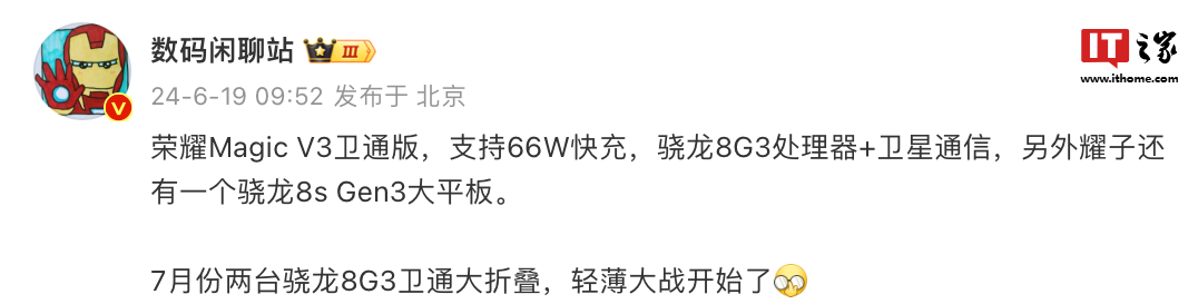 博主 @数码闲聊站 今日发文,荣耀 Magic V3 折叠屏手机主打轻薄机身设计,将搭载骁龙 8 Gen3 处理器,支持 5.5G 网络和卫星通话功能,配备 66W 快充和大电池。