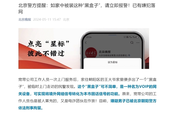 快科技5月13日消息,据“北京晚报”公众号介绍,最近北京出现了一起伪装成宽带人员上门维修,给老人安装电诈黑盒子的案件,目前嫌疑人已落网。