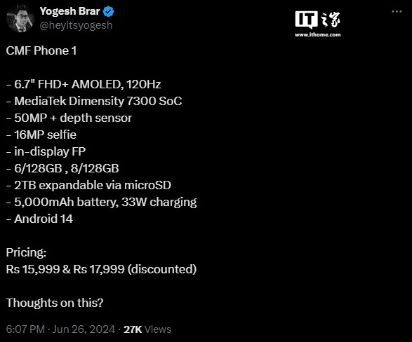 文章来源于互联网:IT之家-Nothing CMF Phone 1 手机配置、价格曝光:搭载天玑 7300,15999 卢比起