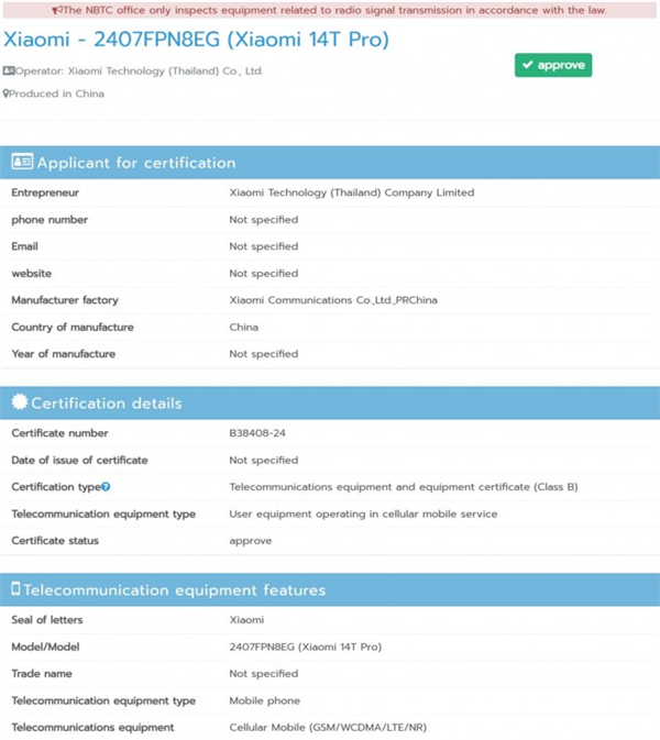 快科技6月28日消息,今天,小米14T Pro获得了泰国NBTC认证,新品将在今年下半年登场。
