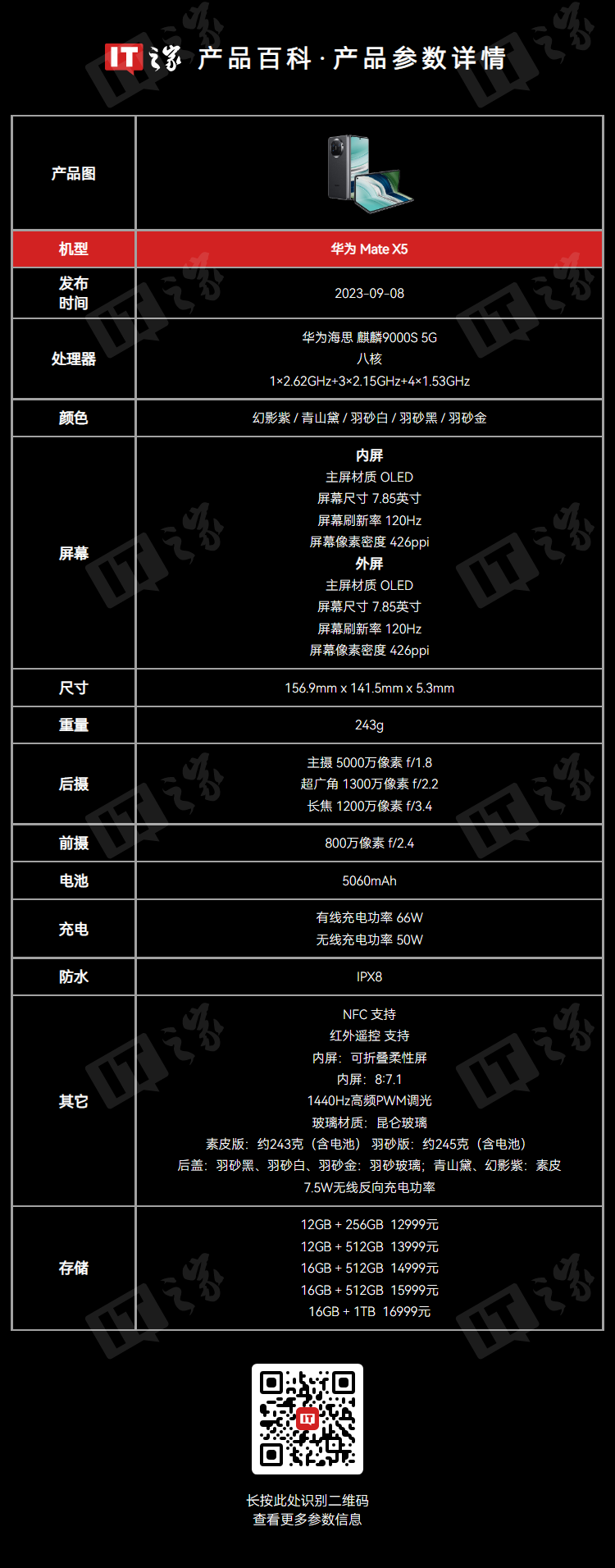 2023 年 9 月,华为折叠屏旗舰华为 Mate X5 加入“先锋计划”开启预定,采用超清临境双屏、玄武钢化昆仑玻璃,支持 IPX8 级抗水,IT之家附配置信息汇总表:
