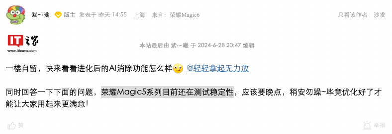IT之家 6 月 28 日消息,荣耀 Magic6 系列手机近日获推 MagicOS 8.0.0.150 (SP8C00E150R110P3) 版本升级,系统更新包大小约 103MB,新增云端大模型 AI 消除功能。
