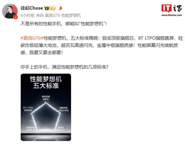 徐起将真我 GT6 称为“性能梦想机”,五大标准揭晓:骁龙顶级旗舰芯、8T LTPO 旗舰直屏、硅碳负极轻薄大电池、超百瓦高速闪充、金属中框旗舰质感。