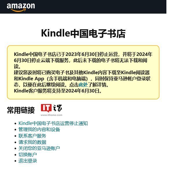 IT之家 6 月 29 日消息,亚马逊 Kindle 中国电子书店将于 2024 年 6 月 30 日 0 时起停止运营,此后未下载的电子书将无法下载和阅读,相关客户服务届时也将停止支持。