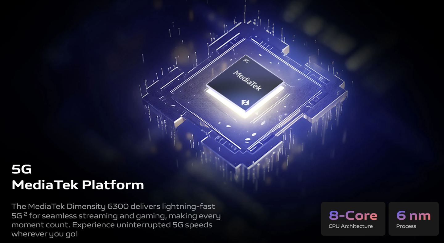 性能方面,该机搭载联发科天玑 6300 处理器,内置 8GB RAM 和 256GB 存储空间,支持通过 microSD 卡拓展至 1TB。
