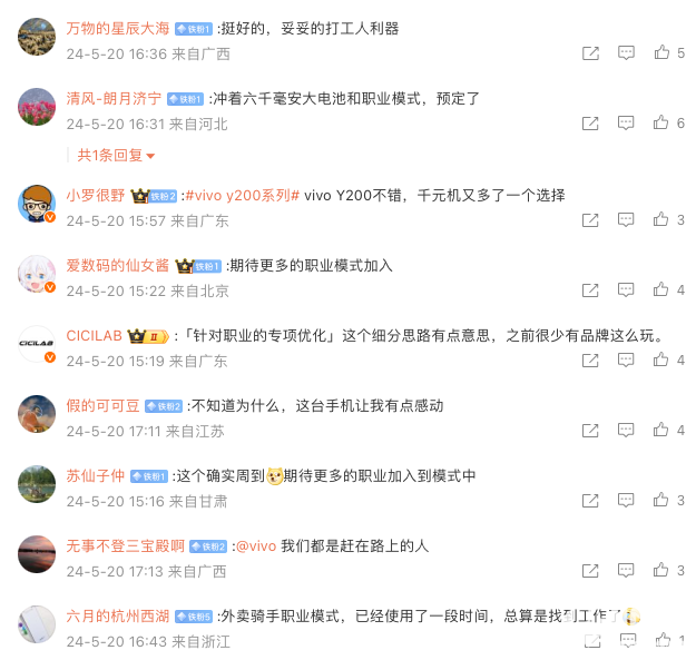 从vivo官方刚刚发布的视频来看,vivo以其敏锐的洞察力,充分考虑到了外送行业的工作特点,通过在Y200系列功能上的细微改变,就能让外卖员在工作中更方便、更安全、更省心。不少网友也纷纷给出了 “ 蓝厂是懂骑手小哥的”以及“期待更多的职业加入到模式中”等好评。