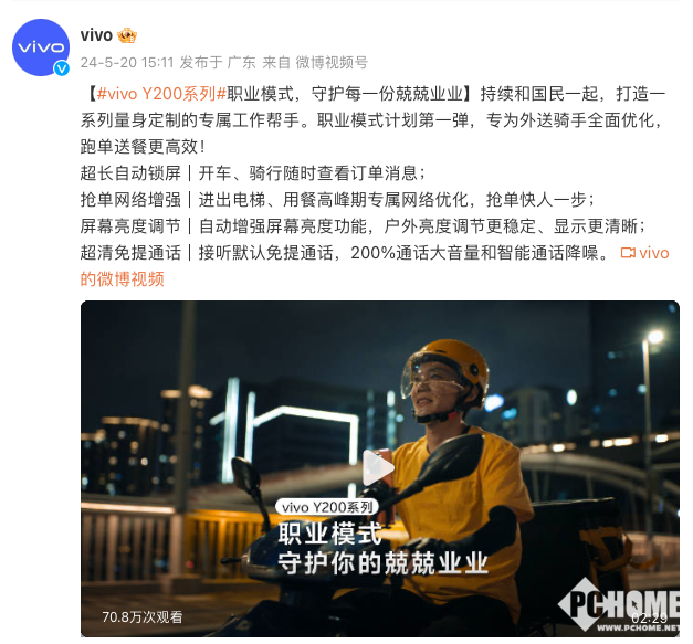 vivo在5月20日发布的Y200系列行业首推“职业模式”,这一创新不仅解决了外送骑士在工作中遇到的诸多难题,也展现了vivo作为科技企业代表之一对社会责任的积极担当。