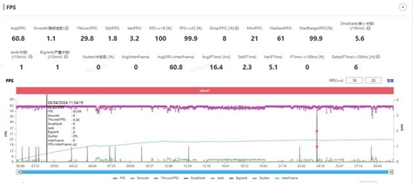 而在游戏方面,笔者测试了热门手游《原神》。在开启高画质+60帧的情况下,30分钟可以跑到60.8帧,稳帧指数达到1.1。