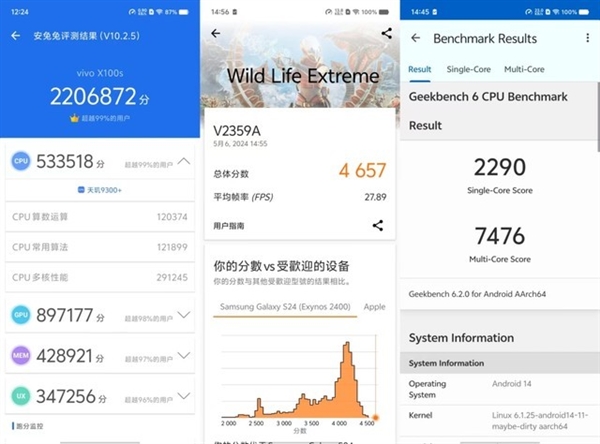 vivo X100s在基准跑分测试中,vivo X100s安兔兔V10版本常温(室温25℃左右)综合跑分超过了220万;而突出GPU图形性能的3DMark Wild Life Extreme中,跑分也达到了4657分;在Geekbench6 CPU基准测试中单核成绩为2290,多核成绩为7476,其表现达到了第一梯队的水准。