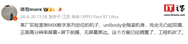 IT之家 6 月 30 日消息,据博主 @体验more 今日爆料称,某厂实验室类 MIX 数字系列定位的机子采用“Unibody 全陶瓷机身、完全无凸起双摄、正面高分辨率屏幕 + 屏下前摄、无屏幕黑边”。目前,这个方案已经搁置了,工程机“砍”了。