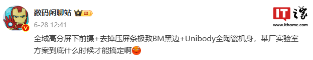 结合此前的报道来看,这款实验室新机预计来自小米旗下。另一位博主 @数码闲聊站 同样透露过一款神秘“实验室方案”新机的配置信息,据称采用“全域高分屏下前摄 + 去掉压屏条极致 BM 黑边 + Unibody 全陶瓷机身。”