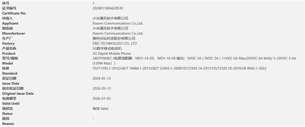 根据认证信息显示,该手机由惠州光弘科技代工,并搭载了120W的MDY-14-ED、MDY-16-EB充电器。