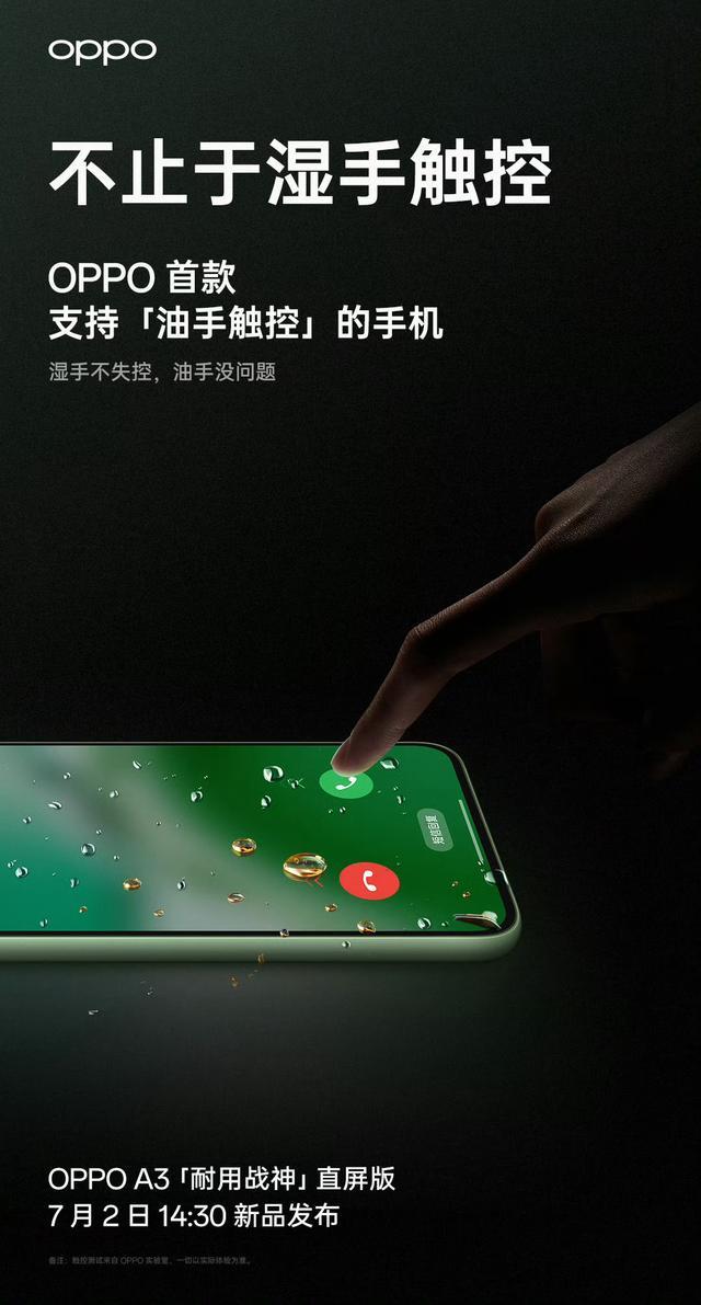 据介绍,湿手触控功能得到升级,OPPO A3 将为 OPPO 首款支持油手触控的手机。