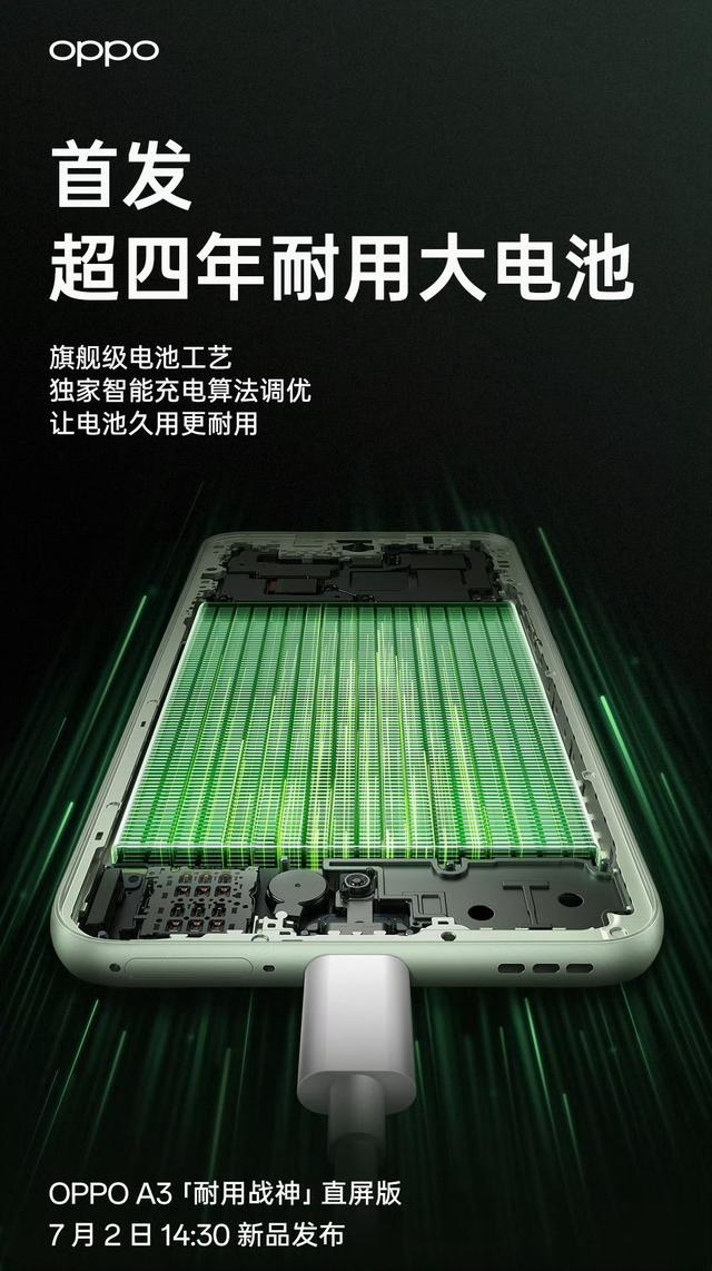 官方表示,OPPO A3 手机通过“五大高温耐久测试”,高温环境可用;该手机还首发“超 4 年耐用大电池”,内置智能充电调优算法。