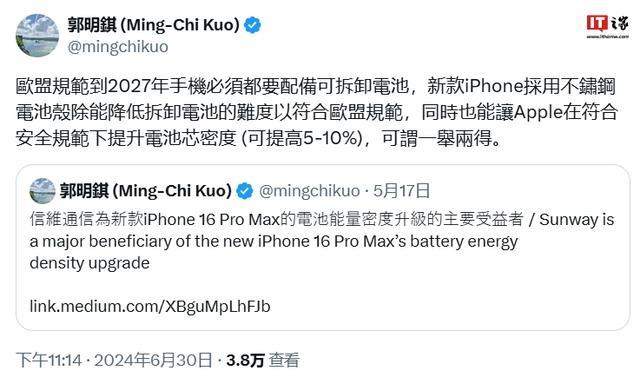郭明錤曾在 5 月 17 日发布爆料消息,iPhone 16 Pro Max 将首次用上这一不锈钢电池壳,从而提升散热性能和保护性,信维通信成为不锈钢电池壳的主要供应商。
