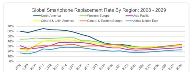 ▲ 全球各地区智能手机换机率:2008 年 – 2029 年