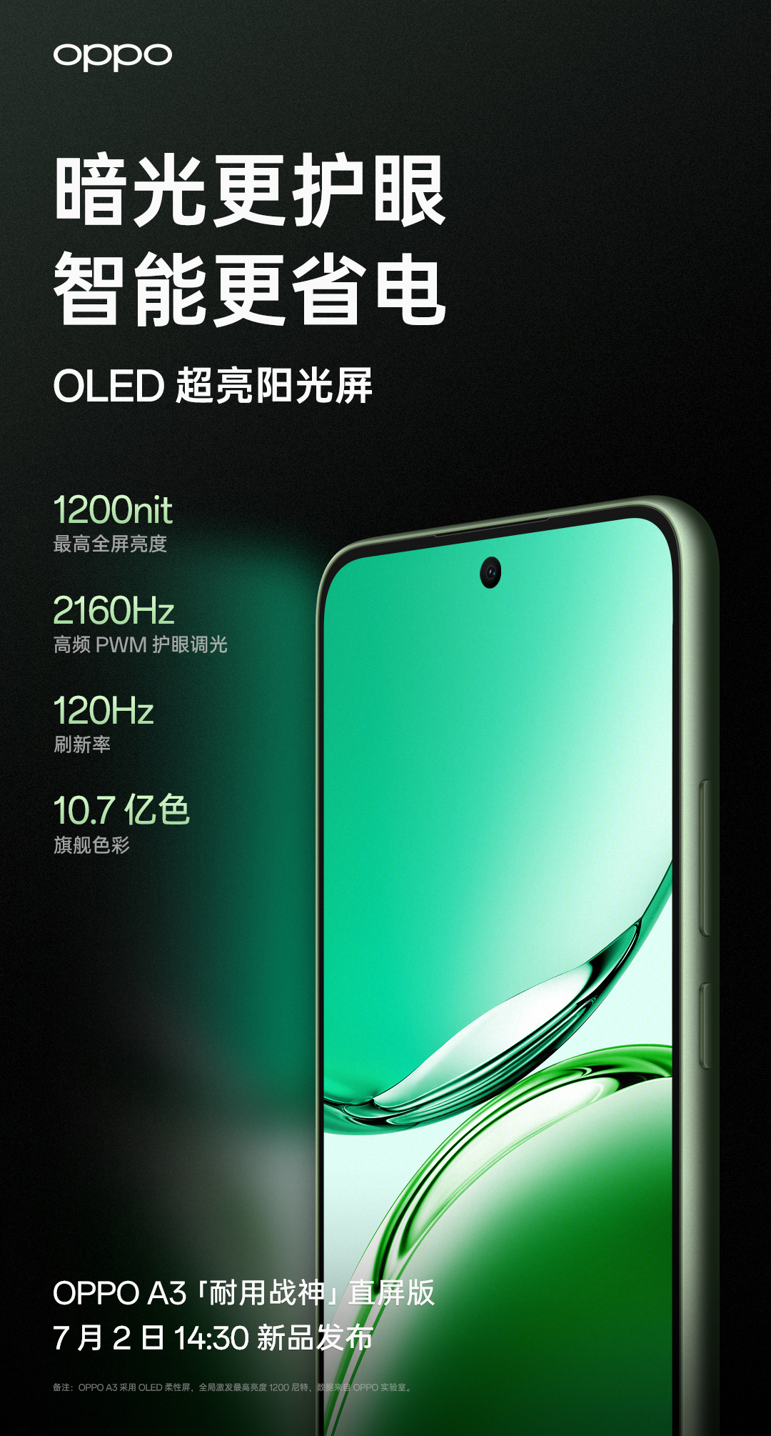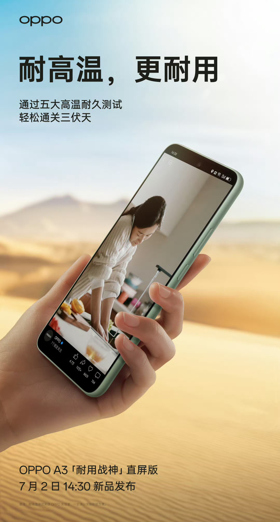 文章来源于互联网:IT之家-OPPO A3 手机直屏版预热:1200nit“OLED 阳光屏”、支持耐高温特性