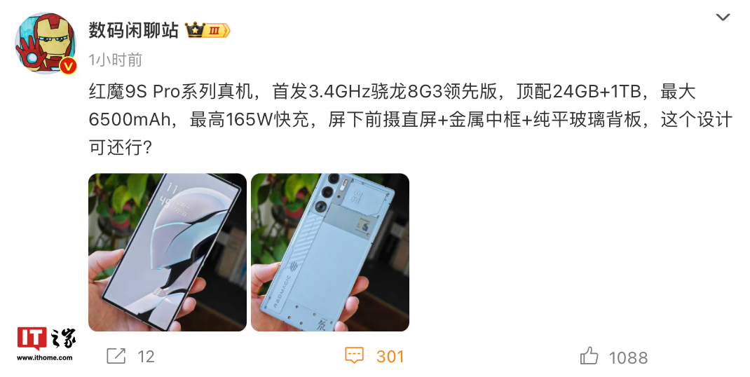 IT之家 7 月 1 日消息,博主 @数码闲聊站今天曝光了红魔 9S Pro 系列手机真机图,该机搭载屏下前摄直屏 + 金属中框 + 纯平玻璃背板,拥有 4 种配色,分别为暗夜骑士、白昼武士、氘锋透明暗夜、氘锋透明银翼。