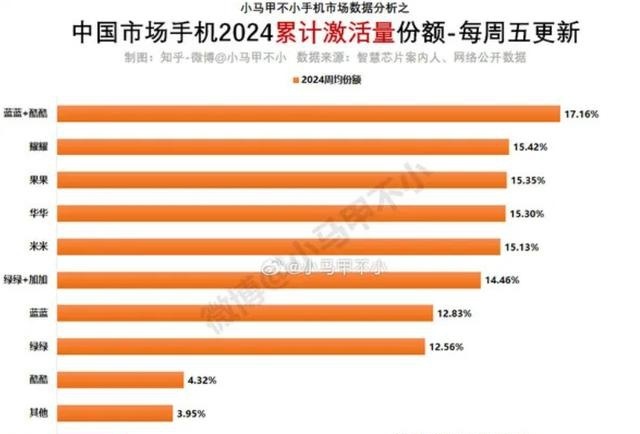 给大家上一个数据,这是某博主整理的,截止至目前2024年中国市场手机品牌激活量数据情况。