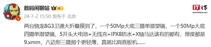 IT之家 7 月 2 日消息,博主 @数码闲聊站今日发文爆料,两台搭载高通骁龙 8 Gen3 处理器折叠屏手机均支持卫星通信,厚度在 9.xmm。