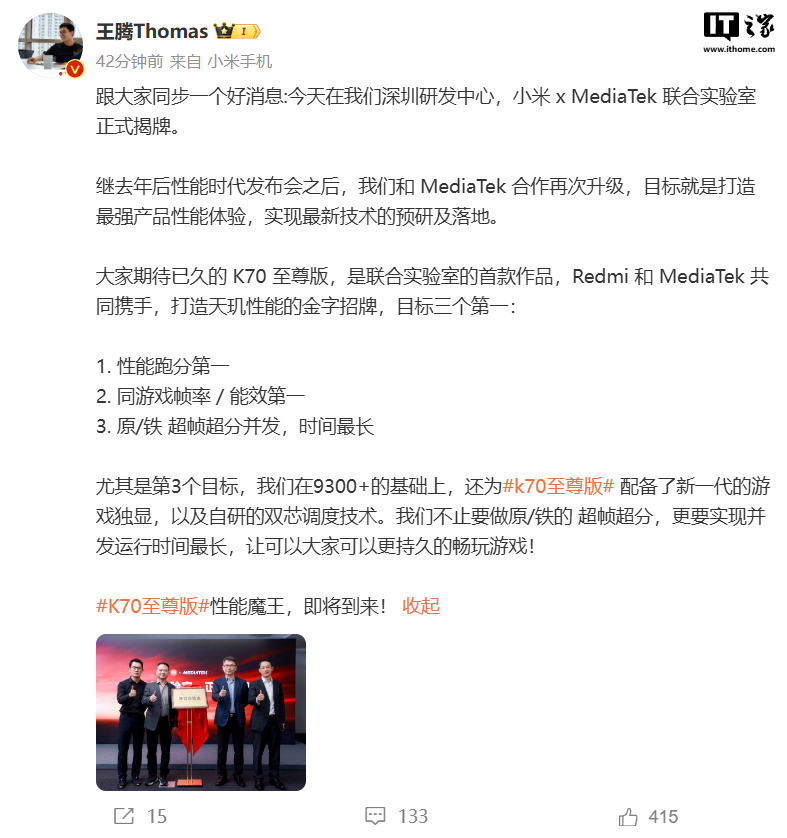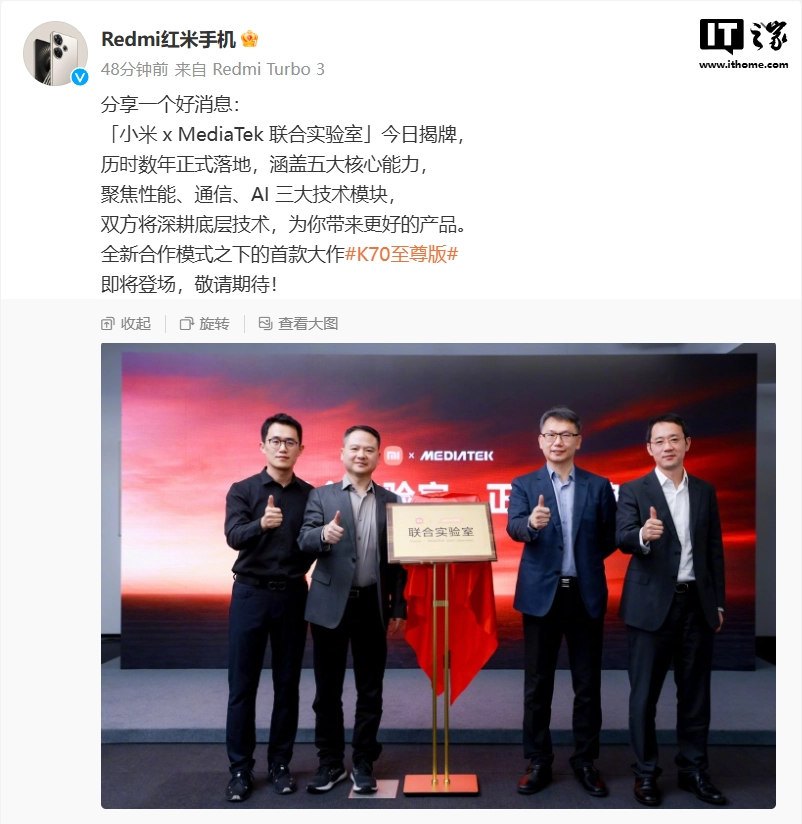 据介绍,Redmi K70 至尊版手机是联合实验室的首款作品,Redmi 和联发科共同携手,目标三个第一: