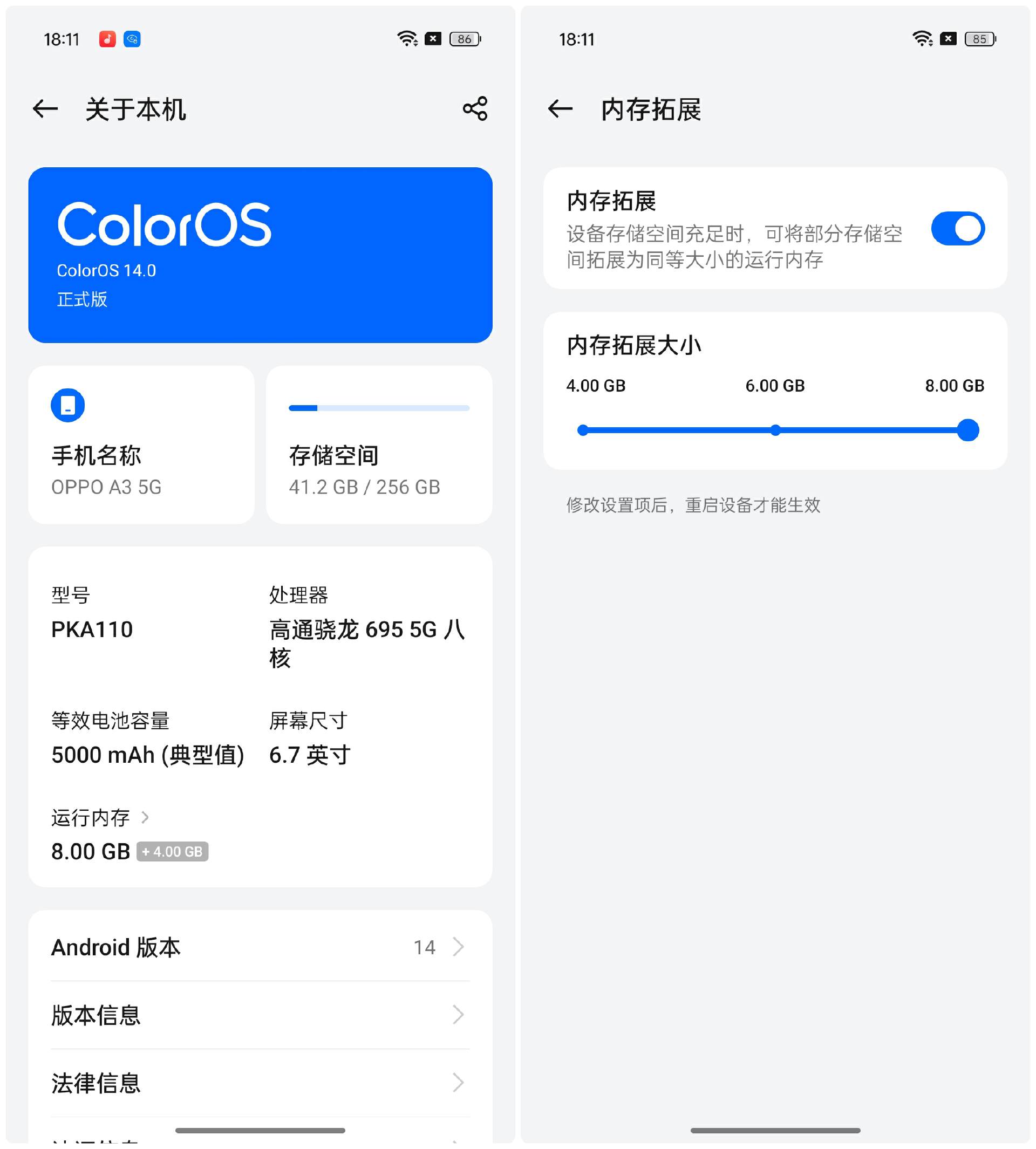 在系统优化层面,OPPO A3 搭载了旗舰性能优化算法及测试,包括焕新存储技术,通过应用压缩、文件消重、等对内存空间及性能进行深度调优,官方表示其通过了 50 月抗老化测试,可以 50 个月流畅护航